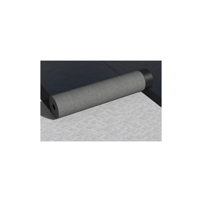 Рулонный битумно-полимерный СБС-модифицированный материал на нетканой основе из высокопрочного полиэстера с легкосгораемой полиэтиленовой пленкой на верхней стороне полотна и мелкозернистой посыпкой на нижней.